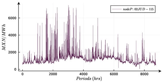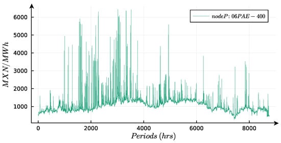 The locational marginal price (LMP) depends on various factors, which include transmission line congestion and system losses. These factors result from the characteristics of the power grid. Historical data from the real-time market (MTR) are utilized to capture fluctuations in electricity prices, with particular attention to the LMP at two specific nodes. One of these nodes is “06PAE-400,” located in the NE zone [30], as illustrated in Figure 4.
