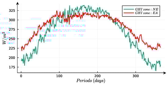 Solar Global Horizontal Irradiance (GHI) represents the total solar energy reaching a horizontal surface on Earth, combining direct radiation from the sun and diffuse radiation from the atmosphere [31]. It is measured in Watts per square meter (W/m2) and is a crucial indicator for assessing solar energy potential in specific locations. GHI data obtained from the Modern-Era Retrospective analysis for Research and Applications, Version 2 (MERRA-2) dataset [32]. For the NE zone, the GHI data is collected near San Fernando, Tamaulipas, while for the EA zone, from Salina Cruz, Oaxaca. The average GHI values are shown in Figure 6.