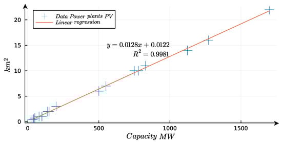 The data exhibit a clear linear trend, as Figure 7 depicts. By applying the linear regression method, we derive an equation that describes the required area of a PV system based on its capacity. This relationship is expressed by Equation (24), where x represents capacity in and y represents area in km2.