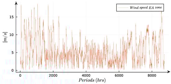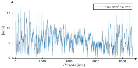 The wind power generation of the Wd system is determined using the findings presented in [23]. The wind speeds at specific geographical locations are taken into account: (25° N, 97°30′ W) for the NE zone (refer to Figure 8) and (16° N, 94°375′ W) for the EA zone (refer to Figure 9). These wind speeds measured at a height of 10 m and are then extrapolated to a height of 100 m using the following relationship [36]: