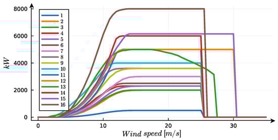 The relationship between wind speeds at different heights is described by Equation (25), as discussed in [37]. The variables and represent the wind speeds at heights and , respectively, while denotes the vertical wind shear coefficient [38]. For this specific case, a value of is used, as reported in [23]. The calculated wind speeds at 100 m height are stored in a vector denoted as . These values are then interpolated based on the wind turbine generation curves [39]. The offshore wind turbine models considered in the analysis are presented in Table 2, and their corresponding generation curves can be observed in Figure 10.