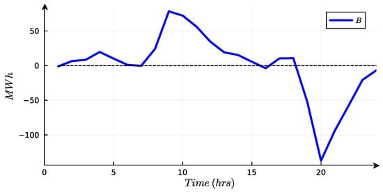 The parameter M represents a large constant, with a value of 10,000 utilized in the application of the Big M method [27]. Furthermore, the battery is subject to charge and discharge limits specified by the values for each period p. This constraint holds for all and .