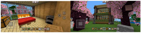 Participants were randomly assigned to either the experimental group or the comparison group. This study employed a nonequivalent group pretest–post-test design. Both groups underwent physical instruction, with the experimental group using the metaverse Minecraft platform (https://www.minecraft.net/ accessed on 18 July 2024), while the comparison group used internet image platforms for instructional assistance. The metaverse Minecraft platform is a 3D virtual space where users, through their avatars, can communicate by writing, drawing, and creating 3D models in the space, as shown in Figure 1. The main teaching procedures included 1. introduction and experience, 2. design thinking, 3. presentation and sharing, and 4. conclusion, as outlined in Table 1.