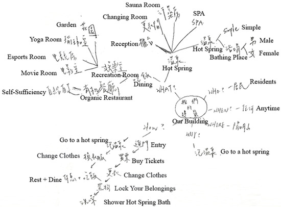 In this study, we investigated the effect of the metaverse on green building concept learning, creative design performance, and learning engagement. Concept mapping was used to assess the effectiveness of concept learning, assigning scores for linkages, hierarchical structure, cross-linking terms, and example items. The scoring criteria for concept mapping employed the method proposed by [34], where linkages represent connections between concept terms, with each valid linkage scoring one point. The hierarchical structure indicates the level of relationship (from top to bottom), with each valid level receiving five points. Cross-linking terms indicate the relationships between concept terms in different levels, with each cross-link scoring 10 points. The examples demonstrate the specificity of domain knowledge, with each example scoring one point. Based on the analysis of the results, the reliability coefficient α was 0.783 (p < 0.01), indicating high reliability among raters [61]. Figure 2 shows the green building concept map drawn by the participants.