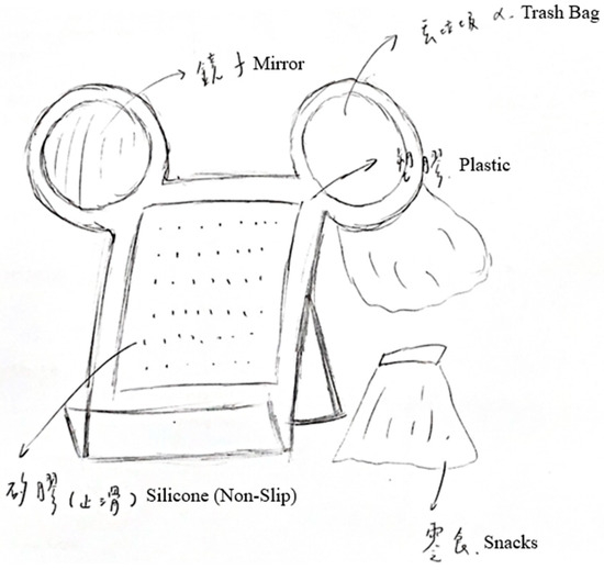 For creative design performance, scoring was based on value (i.e., performance and multifunctionality), usability (i.e., specificity and completeness), novelty (i.e., functionality, structure, appearance, and materials), and elaboration (i.e., aesthetics) [62,63,64,65]. In educational research, the pre- and post-tests are unrelated to ensure the accuracy and reliability of measurement results and minimizing interference from external factors. This study focused on creative design performance, with the pretest using “Creative Phone Stand Design” and the posttest using “Green Building Creative Design Project”. Two senior teachers were invited to score the designs. The correlations of the four evaluation items with the total score were 0.875, 0.746, 0.791, and 0.893, respectively. The overall reliability coefficient α was 0.802, indicating high reliability [66]. Figure 3 shows the pretest “Creative Phone Stand Design” for participants’ creative design performance, followed by the post-test “Green Building Creative Design Project”.