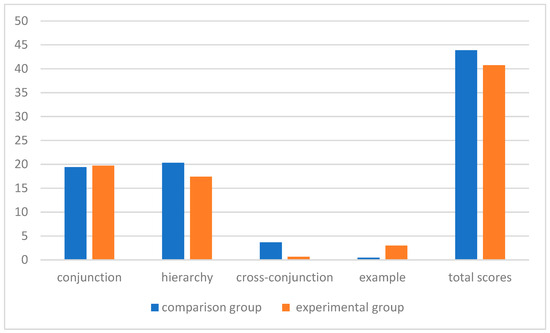 H1 was that the metaverse has positive effects on concept learning. According to the independent sample t-tests, the example dimension of concept learning in the experimental group was significantly higher (t = −3.115, p < 0.05), indicating a significant positive effect of the metaverse on the example dimension of concept learning. The experimental group had higher mean scores in linkages and examples in concept learning than the comparison group. However, the experimental group had lower mean scores in hierarchical structure, cross-linking terms, and total scores than the comparison group, with no significant effect, indicating different effects of the metaverse on concept learning (Figure 4).