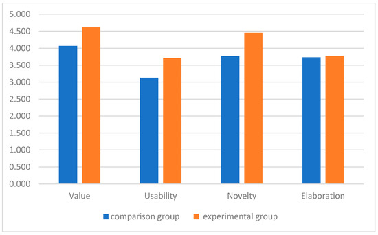The experimental group had higher mean scores in value, usability, novelty, and elaboration than the comparison group (Figure 6).