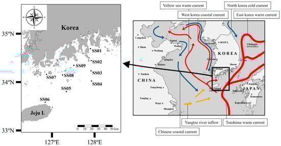 The representative sea currents in the summer around the Korean Peninsula were suggested by the Korean Hydrographic and Oceanographic Agency [] and sampling maps on the Southern Sea of Korea (Sampling points SS01–SS09, 16–19 September 2019); The red, blue, and yellow dash lines are the warm and cold sea currents, and Yangtze River inflow, respectively.