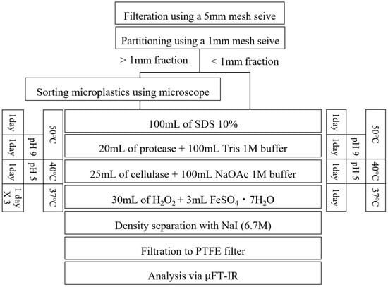 First, 10% SDS was used to increase the efficiency of organic matter removal before enzymatic treatment, as it softens the residues of zooplankton and phytoplankton to increase the contact areas []. The samples were cultured for 24 h at 50 °C using 100 mL of 10% SDS. Protease, used in primary enzymatic treatment, promotes the decomposition of planktonic residues by dissolving protein chains []. Protease A-01 (subtilisin, Wolfenbüttel, Germany) was used, which has optimal activity conditions at pH 9.0 and 50 °C []. Therefore, 1 M PBS with the pH adjusted to 9.0 by adding NaOH was prepared. In total, 20 mL protease and 100 mL of PBS were added to the sample and mixed and the mixed sample was incubated at 50 °C for 24 h. Cellulase, used in the secondary enzyme treatment, promotes the decomposition of phytoplankton cell walls and other plant residues. Cellulase TXL (EC 3.2.14, ASA Spezialenzyme GmbH, Wolfenbüttel, Germany) was used, which has optimal activity conditions at pH 5.0 and 40 °C []. Therefore, 1 M PBS with the pH adjusted to 5.0 by adding HCl was prepared, 25 mL of cellulase and 100 mL of PBS were added and mixed with the sample, and the mixed sample was incubated at 40 °C for 24 h. Thereafter, to remove residual organic matter in the sample, Fenton oxidation was carried out by mixing 50 mL of hydrogen peroxide (H2O2) and 0.070 mg of FeSO4·7H2O with the mixture; in the case of samples larger than 1 mm that have large amounts of organic matter, Fenton oxidation was repeated three times.