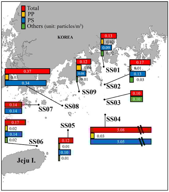 Six polymer types (PP, PE, PS, nylon, PVC, and butyl acrylate) were detected using the FT-IR inspection (Figure 5). PS accounted for 94.72%, the most considerable portion of all materials, with 6.06 particles/m3, followed by PP (0.15 particles/m3, 2.31%) and butyl acrylate (0.11 particles/m3, 1.75%). In particular, among the materials detected at SS04, which showed the highest abundance of MPs, PS was dominant, accounting for 99.49% with 5.05 particles/m3. In addition, butyl acrylate was detected only at SS02 and SS03, showing a high detected amount of 74.14% at SS03.