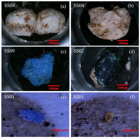 The detected representative microplastic images in the present study ((a,b) polystyrene; (c,d) polypropylene; (e) polyvinyl chloride; and (f) nylon).