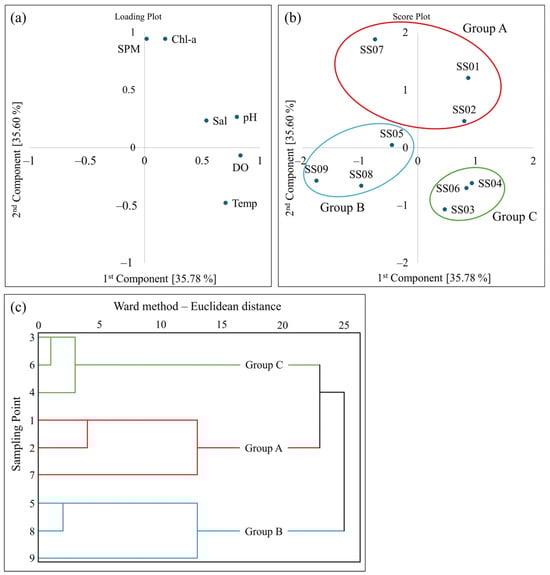 Sampling points SS05, SS08, and SS09, located in the central parts of the study areas, revealed relatively lower water temperature, salinity, pH, and dissolved oxygen than adjacent sampling points, as shown by the negative contribution of PC1; they were grouped into Group B.