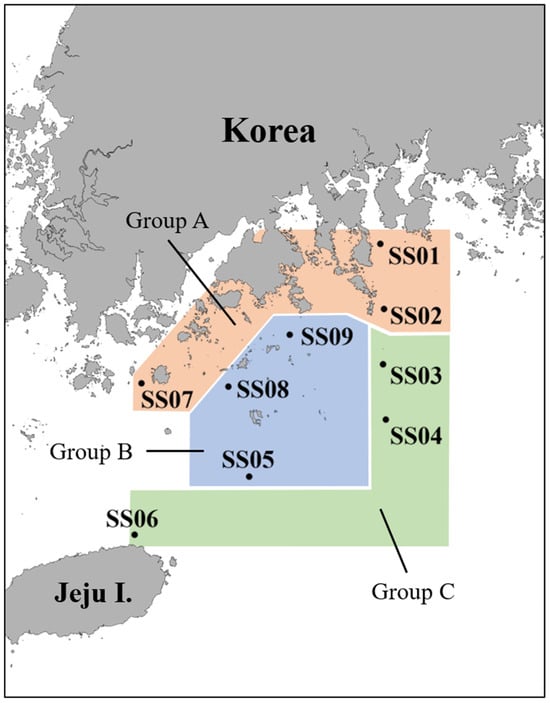 Meanwhile, the Southern Sea of Korea is geographically adjacent to Korea, China, and Japan and is a sea area connecting the Yellow Sea in the west, the northeastern part of the East China Sea in the south, and the East Sea in the east, having complex oceanographic characteristics []. According to Yeh and Kim [], in summer, a specific low salinity distribution and stratification appear due to the effects of water masses such as the Yangtze River influence [], Tsushima warm current water [], Yellow Sea bottom cold water [], and the coastal waters of the Yellow Sea [] along with the river water that flows into the Southern Sea of Korea from the Yeongsan River and Seomjin River []. The nutrients necessary for biological growth are satisfied by the inflow of water masses with different characteristics [] and freshwater originating from land []. Accordingly, various marine organisms inhabit the Southern Sea of Korea based on its high essential productivity [], and active fishery activities are entailed, including fishery farming on fish, shellfish, and seaweeds [].