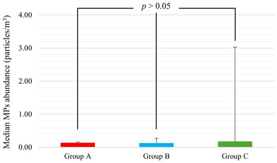 Minutely, MP abundance in Group A (p = 0.463) followed the normal distribution, but Groups B (p < 0.001) and C (p = 0.023) did not (Shapiro–Wilk test, n = 3). The ranges in Groups A, B, and C were 0.13–0.17 (median 0.14 ± 0.02) particles/m3, 0.12–0.37 (median 0.12 ± 0.14) particles/m3, and 0.10–5.08 (median 0.17 ± 2.85) particles/m3, respectively (Figure 8).