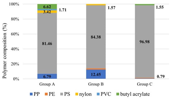 The predominant MP polymer type in the whole sampling point was PS, accounting for 81.5%, 84.4%, and 97.0% of the polymer composition in Groups A, B, and C, respectively (Figure 9). The most considerable portion (90.8%) of PS was observed as expanded polystyrene (EPS), commonly known as styrofoam, which is frequently adopted in fishery industries [].