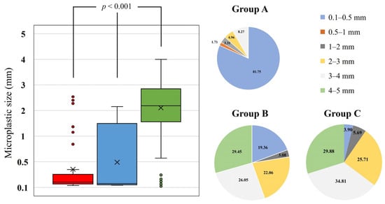 MPs were classified into size groups: 0.1–0.5 mm, 0.5–1 mm, 1–2 mm, 2–3 mm, 3–4 mm, and 4–5 mm. Since the maximum length of particles that can pass through a 300 μm mesh is about 0.42 mm [], 0.5 mm was set as the reference size, and MPs larger than 1 mm, which is the boundary between micro and milli, were detected in large quantities; the particles were classified in units of 1 mm.