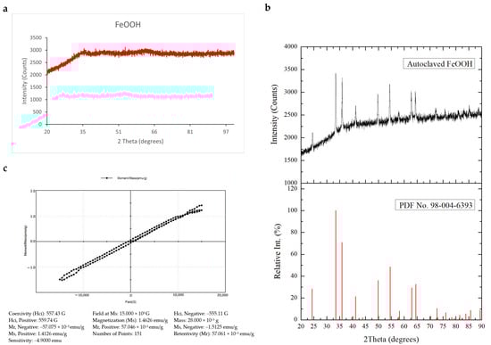 X-ray diffraction (XRD) spectra of FeOOH precursor (a) before autoclaving and (b) after autoclaving, and (c) magnetization curve of unautoclaved precursor used for experiments.