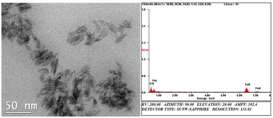 TEM analysis showed that the FeOOH particles were nanorods with an average width of 2 nm and average length of 26 nm (Figure 2). The chemical composition of the particles was analyzed using EDS, which elicited characteristic signals for only Fe and O.