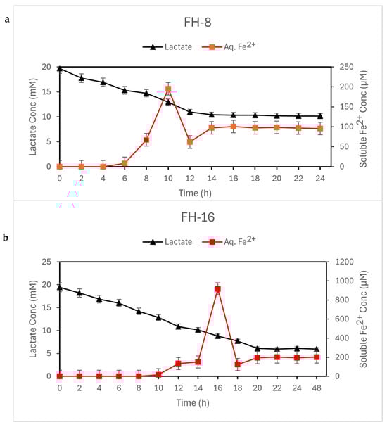 Ferrous (Fe2+) ion dissolution and lactate utilization by Shewanella putrefaciens CN-32 in saline. Initial concentrations were 1 × 107 cells/mL, 20 mM lactate, and (a) 8 mM or (b) 16 mM precursor. Data presented are averages of triplicate results; the variation was ≤ 5%.