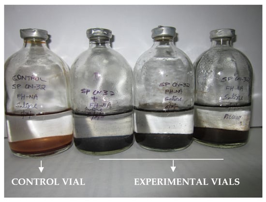Control vials with only the precursor and lactate (no inoculum) in saline did not exhibit any change in color or magnetic behavior during the incubation period (Figure 4). Thus, it was confirmed that the use of an unsterilized precursor did not affect the experimental outcome and that the reduction activity was biotically mediated by the S. putrefaciens CN-32 inoculum alone.