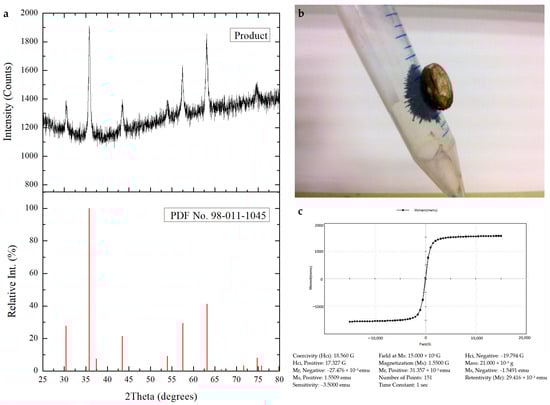 (a) Representative XRD spectrum, (b) image, and (c) magnetization curve of black precipitates at the end of incubation.