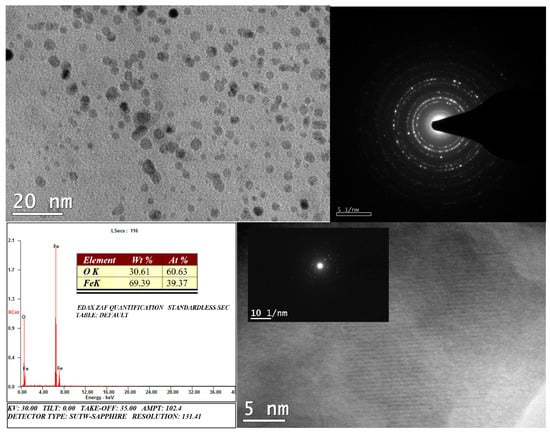 TEM imaging (Figure 6) showed that the MNPs formed were fairly monodispersed with low aggregation. They were pseudo-spherical in shape, with an average diameter of 6 ± 2 nm. The TEM diffraction spectrum suggested that the particle surface was polycrystalline. Furthermore, the lattice fringes observed under HR-TEM implied a highly crystalline core. EDS analysis of the MNPs elicited peaks for Fe and O, with no characteristic signals of impurities.
