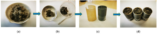 According to the established mix proportions and densities, samples were prepared (Figure 2). The required amount of WTTF was taken and put into the mixing container. After adding the binder, everything was thoroughly mixed for 2 min using the mixing tools.