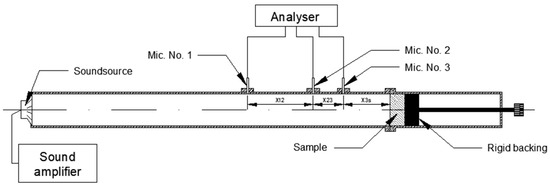 The method of determination of the sound absorption coefficient in impedance tubes is based on the standard method, described in the ISO 10534-2 standard, the two-microphone technique [40]. The impedance tube used for this study was 30 mm in diameter, and all samples were rigidly backed, to prevent transmission. In Figure 3 is presented the principal scheme of the impedance tube. No. 1, No. 2, and No. 3 represent the microphones used for the determination of sound pressure. With microphones No. 1 and No. 3, the low-frequency sound absorption coefficient was determined (160–1000 Hz), and with microphones No. 2 and No. 3, the high-frequency sound absorption coefficient was determined (1000–5000 Hz). The distance between microphones No. 1 and No. 2 was x12 = 100 mm, the distance between microphones No. 2 and No. 3 was x23 = 20 mm, the distance from microphone No. 3 to the sample was x3S = 60 mm. Such distances between microphones are due to wavelength characteristics, meaning that lower-frequency sound waves have long wavelength, and therefore, the distance between the microphones should be long enough to register the data, while high frequency sound waves have short wavelength, and the distance between microphones should be shorter. The results of the sound absorption coefficient are presented in the 1/3 octave band, and the number of averages was set to 50. Measurements were carried out using the ‘AcoustiTube’ impedance tube manufactured by AED (Dresden, Germany). The equipment complies with first-class accuracy equipment. Measurement data were processed using the software ‘AcoustiStudio’ (version 2.2.1) designed for the impedance tube used in this study.