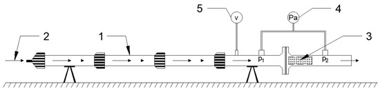 Airflow resistivity measurement equipment: 1—air flow pipe, 2—directional air flow, 3—sample holder, 4—differential pressure gauge, 5—air flow velocity meter.