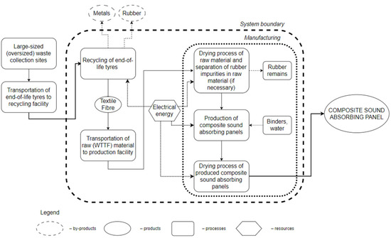 The boundaries of this research include the following processes: recycling of end-of-life tyres; transportation of waste tyre textile fibre to the place of production of composite panels; drying of waste tyre textile fibre; production of composite sound absorbing panels; drying of composite sound absorbing panels. Energy sources (electricity), water resources, and used binders and rubber waste are also evaluated.