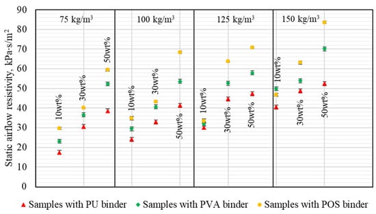 According to the results presented, we can see that as the samples’ density increased, airflow resistivity increased as well. Such a phenomenon can be justified as the density increases. It is more difficult for air to enter the composite material; therefore, airflow resistivity increases. Resistance occurs due to the fact that when the density of the sample increases, the fibre content in the sample also increases, which means that a lower porosity is created [45].