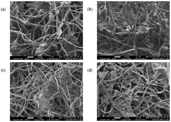 Comparing Figure 7b,d,f, we can see that increased binder content increases surface coverage, thus increasing airflow resistivity. When 50 wt% binder is found in the composite, it not only fills the pores of the rubber agglomerates, but it also covers the surface of the rubber agglomerates, and it also partially covers the fibres and the spaces between them. The contact area between the fibre and the binding material increases significantly. POS samples (Figure 7f) can be observed. Biopolymers are less deposited on rubber conglomerates because of the specific properties of biopolymers (pH, viscosity, etc.).