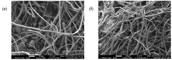 Scanning electron microscopy images: (a)—samples with PU binder 10 wt%; (b)—samples with PU binder 50 wt%; (c)—samples with PVA binder 10 wt%; (d)—samples with PVA binder 50 wt%; (e)—samples with POS binder 10 wt%; (f)—samples with POS binder 50 wt%.