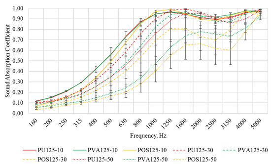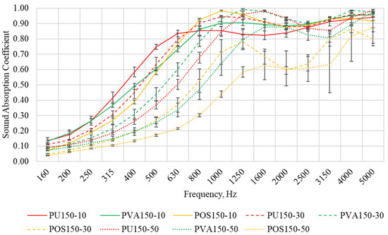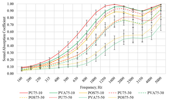 In Figure 8 are presented sound absorption results of samples that are made using PU, PVA, and POS binders (binder content 10, 30, and 50 wt%) and the density of the samples was 75 kg/m3. According to the measurements results, it can be seen that the highest sound absorption results in the whole spectrum are observable by samples that contain 10 wt% of the binder. When the binder content increased to 30 wt% and then to 50 wt%, the sound absorption of the material decreased. That can be explained by the fact that the binder does not fill up all open cavities (when binder content is 10 wt%), leaving paths for sound wave to propagate in the sample, meaning that increased binder content in the sample creates a larger contact area, thus reducing porosity (referring to Figure 7a,b). That also can be explained by airflow resistivity results, where it is visible that an increasing amount of binder increases airflow resistivity, as well. The first peak of sound absorption is obtained when the thickness of the sample is at least 1/4 to 1/8 of sound wave wavelength [53].