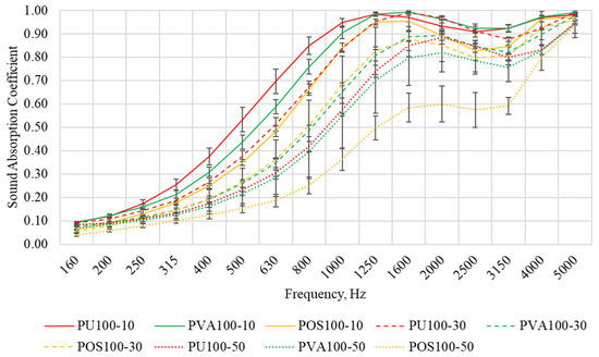 In Figure 9 are presented sound absorption results of samples made using PU, PVA, and POS binders (binder content 10, 30, and 50 wt%), and the density of the samples was 100 kg/m3. It can be observed that with an increase in density, the sound absorption coefficient increased in the whole spectrum, and the peak shifted to the lower frequency. As discussed regarding previous results, we can see that the highest sound absorption results are visible when the sample has 10% by weight of binder in the composition. Although it was discussed previously that the difference can be observed when using different binders, in this case, some have very similar results. For instance, the sound absorption of the PVA100-30 and POS100-30 samples does not differ much; only at high frequencies do we see a difference in sound absorption. A similar situation is observed with the samples PU100-50 and PVA100-50 (especially low frequencies). Such a tendency presumably can be explained by the fact that in both cases, the binder covered the same part of the fibres, thus creating closed porosity.
