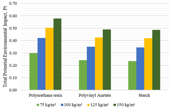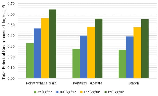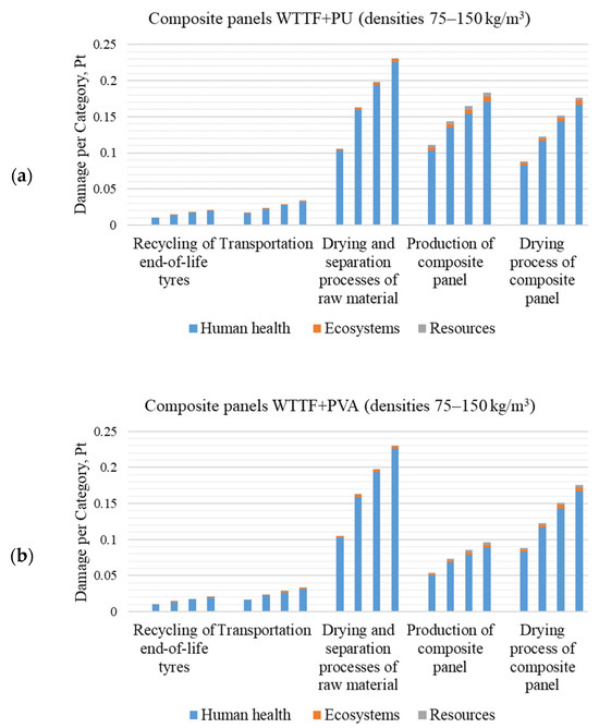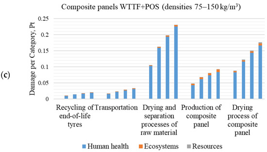 Evaluation and comparison of the newly developed composite sound absorbing panels was carried out according to endpoint indicators, which include damage to human health, damage to ecosystems, and damage to resources. These are the three main evaluation indicators that make up the overall potential impact of the product on environmental components. A brief explanation of each indicator’s characterisation factor is provided [44]: