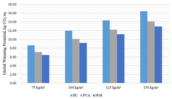 In the last stage, the Global Warming Potential produced by the composite sound absorbing panels was evaluated. By modelling, it was determined that during the production of different panels with an area of 1 m2 and a mass ranging from 4.40 to 8.82 kg/m2, a total of 6.41 to 16.41 kg of CO2 equivalent would enter the ambient air (Figure 15).