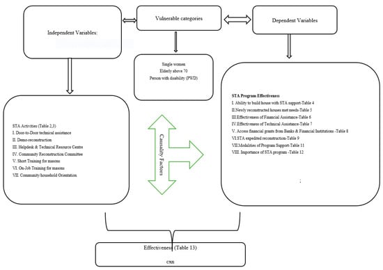 This study aims to assess the effectiveness of the ‘demand-driven’ STA program in rural private housing reconstruction settings through a quantitative survey of 304 vulnerable beneficiaries. The conceptual framework given below illustrates the causal relations between independent variables (STA Activities: seven activities) and dependent variables in program outcomes, focusing on the user-end perspectives of vulnerable beneficiaries.