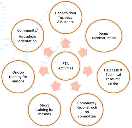 Despite the success of Owner-Driven Reconstruction (ODR) in constructing nearly 741,031 [] houses in Nepal, post-earthquake challenges persist for vulnerable populations. To address inclusivity, a Socio-Technical Assistance (STA) module was introduced in a collaboration between the government and partner agencies to ensure that ‘No one is left behind’. Recognizing the distinct needs of vulnerable beneficiaries, the implementation of the STA module was deemed necessary [,]. The GoN identified 18,505 beneficiaries (2.4%) as vulnerable from the 782,695 beneficiaries of the top-up housing assistance program []. The STA program entails seven core activities (refer to Figure 2), outlined by the NRA and HRRP, and complements financial and technical assistance by guiding beneficiaries to meet reconstruction standards within a specified timeframe [,]. It aims for transformative change, requiring behavioural shifts and empowering communities through capacity-building training and income-generating activities.