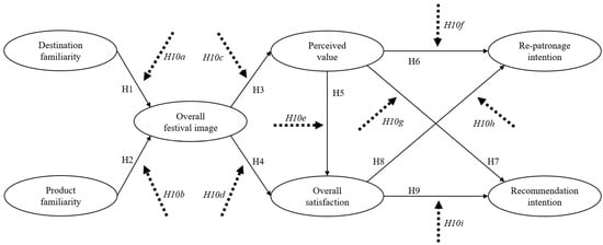 The more familiar an individual is with a place or a product, the more likely they are to generate a favorable perceived image of the place or the product [,,,,,], which has been verified in rural tourism, slow tourism and medical tourism. Some researchers have demonstrated that product familiarity and destination familiarity positively influence customers’ perceived image in the settings of peer-to-peer accommodation and cross-national travel [,,,]. A literary festival study verified that familiarity has a positive and direct influence on perceived quality and festival brand image, which in turn can promote the formation of festival loyalty []. Chirakranont and Sakdiyakorn (2022) also demonstrated that travelers’ experience quality and perceived image toward a craft beer tourism destination is closely related to their deep interest, knowledge and familiarity with the beer product itself and the beer-making process []. In this study, tourist familiarity involves two main aspects (destination familiarity and product familiarity), and the associations of destination familiarity and product familiarity with overall festival image deserve further examination. Thus, the hypotheses are presented below.