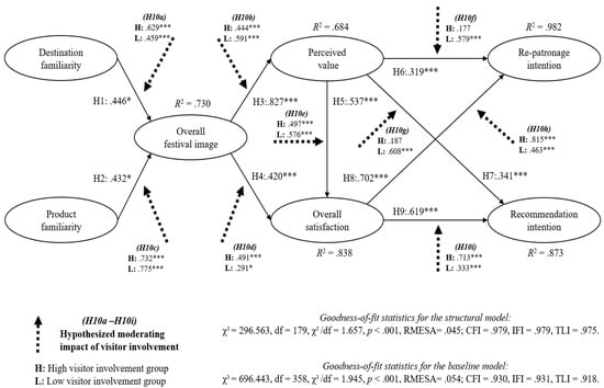 Tourists who are deeply involved in a certain product/service may be less concerned with perceived value while immersing themselves in the experience [], which is more obvious in the consumption experience of festival tourism [,]. This echoes the viewpoint of Hwang et al. (2020) that involvement plays a significant moderating role in affecting the associations among cognitive and affective perceptions (e.g., motivations and attitudes) and pro-environmental intentions for using drone food delivery service []. Chi et al. (2022) examined the moderating role of community involvement in the relation between cognitive festival image and festival loyalty intentions with two mediators of affective and overall festival image []. Kim et al. (2015) declared that different levels of tourist perceived value, satisfaction and loyalty intentions toward a festival product are related to festival involvement []. Nonetheless, how involvement moderates the relationships between festival image, perceived value and satisfaction has been insufficiently explored. The moderation effects of involvement in the associations among perceived quality, satisfaction and loyalty were verified in the food festival context []. Dedeoğlu et al. (2019) found that involvement significantly moderates the relation between tourist perceived image and perceived service quality/value []. Mahasuweerachai and Qu (2011) tested the moderation effect of tourist involvement on the relationships between image, perceived value and satisfaction []. Thus, the following hypotheses are developed.