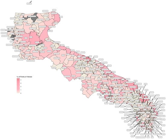 Regional map showing the Apulia region points of interest percentage (%) according to municipality.