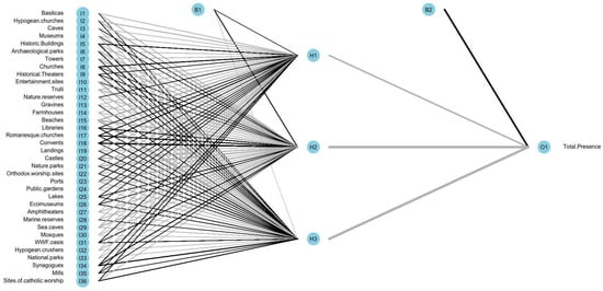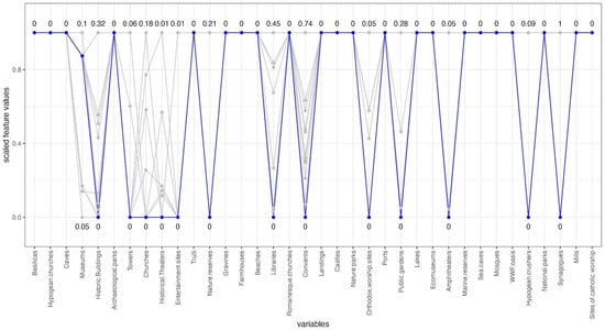 The description of the distribution of tourist attraction factors of the Apulia Region distinguished by province is shown in Table 1. The evaluation of the provinces shows a statistically significant difference between the incoming tourist flows. Italian arrivals turn out to be statistically different in the six provinces, in particular average values of 19,657.179 ± 45,968.85, 13,336.9 ± 14,878.604, 19,195.25 ± 34,109.144, 15,773.531 ± 44,713.718, 9571.613 ± 27,766.27, 10,092.36 ± 16,969.652 are shown relative to Bari, BAT, Brindisi, Foggia, Lecce and Taranto. At the same time, foreign arrivals are different in the provinces, with average values of 15,390.744 ± 46,875.192, 3688.167 ± 11,962.284, 3967.129 ± 15,406.263, 2767.167 ± 5561.916 relative to Bari, Barletta-Andria-Trani (BAT), Brindisi, Foggia, Lecce, and Taranto. This statistically significant difference is also present for the presence of foreign tourists (mean values: 39,689.128 ± 111,297.621, 11,887.7 ± 14,647.34, 41,654.5 ± 83,299.998, 15,229.729 ± 59,129.081, 13,759.355 ± 44,420.864, 10,570.333 ± 21,066.718 related to Bari, BAT, Brindisi, Foggia, Lecce, and Taranto) but no statistically significant differences are shown for the presence of distinct Italian tourists in Apulian provinces. The analysis of the presence of tourist attractions among the different provinces of Apulia showed statistically significant differences in both morphological and environmental and cultural component aspects. The attractiveness related to the environmental and morphological component appears to be statistically significantly distinct with respect to “Natural Areas,” “Nature Reserves”, and “Gravinas” and “Caves”. The attractiveness related to the environmental and morphological component seems to be statistically significant compared to “Natural Areas”, “Nature Reserves”, and “Gravines”. The average presence of natural areas dislocated among the provinces is 0.024 ± 0.156, 0 ± 0, 0.05 ± 0.224, 0.107 ± 0.36, 0.052 ± 0.222 and 0.034 ± 0.186, respectively, for Bari, BAT, Brindisi, Foggia, Lecce, and Taranto. Parallel to the natural areas, the natural reserves in the region are distributed differently in a statistically significant way, an average of 0.024 ± 0.156,0.2 ± 0.421, 0.15 ± 0.366, 0.196 ± 0.48, 0.021 ± 0.14 and 0.138 ± 0.441 for Bari, BAT, Brindisi, Foggia, Lecce and Taranto, respectively. The presence of tourist-attractive gravines is shown to be statistically significantly different among the provinces analyzed as an average of 0.195 ± 0.679, 0.1 ± 0.316, 0.15 ± 0.36, 0.054 ± 0.22, 0.041 ± 0.2 and 0.379 ± 0.862 for Bari, BAT, Brindisi, Foggia, Lecce, and Taranto, respectively. Attractors of a sociocultural nature that showed a different distribution over the territory at a statistically significant level include places of worship and historical value (Basilicas, Hypogean Churches, Romanesque Churches, Towers, Churches, Historical Theaters, Hypogean Crushers and Synagogues). Relative to the provinces of Bari, Bat, Brindisi, Foggia, Lecce and Taranto, the mean presence of the aforementioned points of interest are 0.22 ± 0.525, 0.4 ± 0.84, 0.35 ± 0.48, 0.357 ± 0.48, 0.144 ± 0.5 and 0.207 ± 0.491 for Basilicas, 0.439 ± 0.86, 0.5 ± 0.707, 1.1 ± 1.252, 1.018 ± 1.314, 0.433 ± 0.877 and 0.862 ± 1.50 for Hypogean Churches, 0.415 ± 1.048, 0.4 ± 0.699, 0.6 ± 0.995, 0.054 ± 0.227, 0.247 ± 0.541 and 1.241 ± 2.278 for Romanesque Churches, 0.122 ± 0.331, 0.2 ± 0.422, 0.6 ± 1.095, 0.25 ± 0.477, 0.175 ± 0.677 and 0.069 ± 0.258 for Towers, 0.463 ± 0.674, 0.8 ± 0.919, 0.9 ± 1.586, 0.482 ± 1.128 and 0.196 ± 0.716 for Churches, 0.268 ± 0.708, 0.3 ± 0.483, 0.3 ± 0.47, 0.107 ± 0.312 and 0.052 ± 0.265 for Historical Theaters, 0 ± 0, 0 ± 0, 0.15 ± 0.366, 0.018 ± 0.134, 0.124 ± 0.331 and 0.103 ± 0.557 for Hypogean Crushers, 0 ± 0, 0.1 ± 0.316, 0.05 ± 0.224, 0 ± 0, 0 ± 0 and 0 ± 0 for Synagogues. The distribution of Museums is statistically significantly different among the provinces in the territory, in particular the average attendance is 1.098 ± 1.96, 1.8 ± 1.135, 1.15 ± 1.599, 0.839 ± 0.987 and 0.474 ± 1.191 for Bari, BAT, Brindisi, Foggia, Lecce, and Taranto. Finally, agritourism supply is differentially located among the provinces with an average presence of 0.146 ± 0.358, 0 ± 0, 0.1 ± 0.308, 0.018 ± 0.134, 0.031 ± 0.174 and 0.138 ± 0.351. Figure 1 shows the Apulia region point of interest percentage according to municipality. Figure 2 shows the final Neural Network Model Architecture plot run with a hidden layer consisting of three neurons and a decay value of 0.01. Figure 3 shows the best hyperparameter tuning selection plot using the RMSE metric. Figure 4 and Figure 5 show Garson’s and Olden’s variable importance plots, respectively. Particularly, Figure 4 underlines the role of Beaches as the most associated points of interest to Total presence in the Apulia Region followed by Sea Caves, Natural Parks, and Convents. Figure 5 once again highlights the role of beaches and seaside behavior on Apulia’s tourist attractiveness. Figure 6 shows a bar plot of relative counterfactual changes and Figure 7 shows a counterfactual parallel plot, where real characteristics are shown in blue, while counterfactuals are shown in gray. Figure 6 shows Convents, Libraries, Historical Buildings, Public Gardens, and Museums as the first five most changed features to improving total presences in a randomly selected municipality.