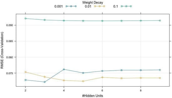 The entire dataset was adopted to build an artificial neural network model on Total Tourist presence as the dependent variable and tourist attractions as regressors. The Caret package was used to build the neural network model. The model was trained using a hidden layer size of 3 to 9 with decay values of 0.001, 0.01, 0.1, and a linear activation function. The Root Mean Square Error (RMSE) was used to select the optimal model using the smallest value []. The final model was run with a hidden layer consisting of three neurons and a decay value of 0.01. Figure 1 shows the Apulia region point of interest percentage according to municipality. Figure 2 shows the architecture of the neural network. Figure 3, shows the variation of the RMSE value according to the combination of the hidden layer size and decay values. The relative importance of each variable as an absolute magnitude was evaluated using Garson’s algorithm (Figure 4). Olden’s algorithm [] evaluated the relative importance of the input variables in the neural networks as the sum of the product of the raw weights of the input-hidden and hidden-output connections (Figure 5). The Counterfactuals package was adopted to build a Multi-Objective Counterfactual (MOC) [] model using a randomly selected row of normalized data frames. The MOC model was constructed to increase total tourist attendance by 20% over that of the randomly selected municipality. The Multi-Object Counterfactual model was built considering “Beaches”, “WWF oasis”, “Caves”, “Sea Caves”, “Archaeological Parks”, ”Marine Reserves”, “Hypogean Churches”, “Castles” as fixed features (not modifiable), and epsilon of zero (no penalization) for 175 generations and an Individual Conditional Expectation (ICE) curve population initialization strategy []. All statistical analyses were performed using RStudio 2023.03.1, with packages: tidyverse, rstatix, gmodels, caret, kableExtra, epiR, iml, ggplot2, and counterfactuals.