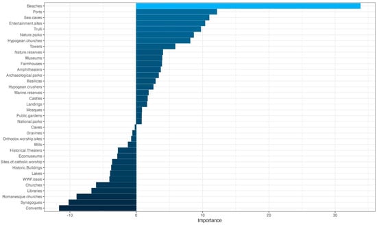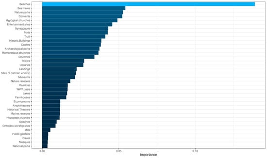 As the main finding, the evaluation of the role of different points of interest on regional tourism flow showed that natural landscape and characteristic sites such as beaches, sea caves and natural parks take a primary role expressed in terms of variable importance in the AI algorithm. Along these lines, comparing our results with the recent IPSOS report (www.ipsos.com accessed on 15 May 2024) on the attractiveness of Apulia in 2023, we found an overlap between the reports of respondents in the IPSOS survey and the findings of our AI algorithm. In fact, the IPSOS report identified beach facilities and access to the sea as the predominant factor in choosing a tourist destination among respondents, followed by natural and historical points of interest.