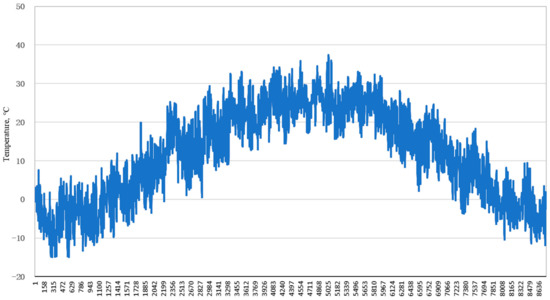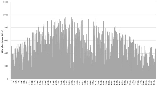 Based on the related definitions of Thermal Design Code for Civil Buildings (GB50176-93), Beijing is a typical city in the cold area of China. Figure 3 and Figure 4 show the hourly dry-bulb temperature and global horizontal radiation in Beijing, respectively. Low temperatures in Beijing in winter can be around −15 °C, while the high temperatures in the summer can be close to 35 °C, respectively. Space heating in the winter season and space cooling in the summer season are necessary in Beijing. Parameters in Beijing in typical meteorological year were used as the input design parameters of both the reference and the NZEB model.