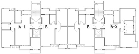 A typical and universal high-rise, zero-energy building model in China was set up. A 12-floor, plank-type, high-rise building with a total area of 5466 m2 was modeled to simulate the feasibility of NZEBs. The building has 48 families in total. Figure 5 and Figure 6 illustrate the layout of the building model. Three kinds of apartments (A-1, B, and A-2) were included in the building. Every apartment consists of bedroom, kitchen, living room, and bathroom. Total floor area of the building is 5466 m2. Parameters of the model in TRNSYS can be found in Table 1.