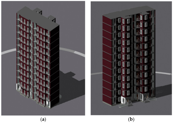 D model of the building (a) and 3D model of the building (b).
