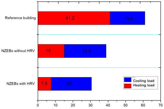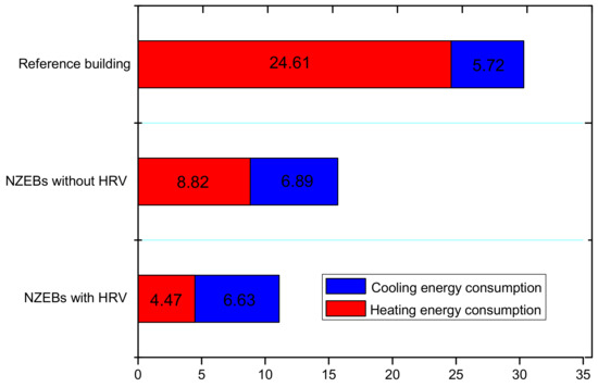 As is shown in Figure 8, the annual energy consumption of the reference building is 30.33 kWh/(m2·a). There is a slight increase in building cooling energy consumption by the use of the NZEBs, which is similar to the comparison shown in Figure 7. The energy consumption of the reference building is 30.33 kWh/(m2·a), while that of the NZEBs with HRV is only 11.1 kWh/(m2·a). More than 50% energy consumption can be saved.