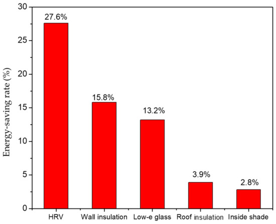 Figure 9 shows that the energy-saving rates of the wall insulation, low-e glass, and fresh air heat recovery system were 15.8%, 13.2%, and 27.6%, respectively. It can be found that the envelope with the wall insulation and window is very important to reduce the energy load. Because the area of the roof is limited for high-rise buildings, the energy-saving rate is around 4%.